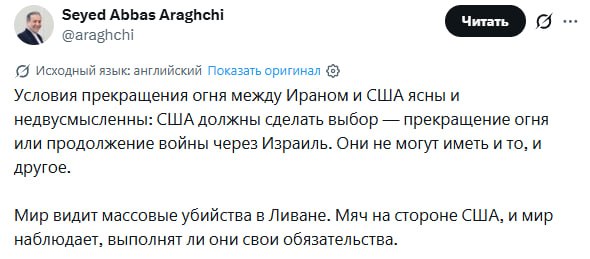 ⚡️США должны сделать выбор — прекращение огня или продолжение войны через Израиль. Они не могут иметь и то, и другое, — глава МИД Ирана Аракчи.