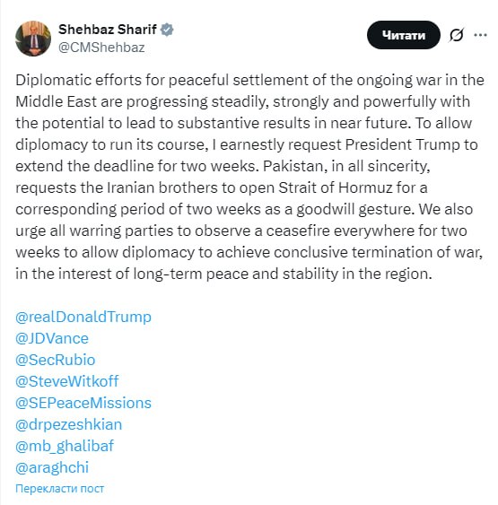 Щоб дати дипломатії можливість виявити себе, я щиро прошу президента Трампа продовжити встановлений термін на два тижні. Пакистан з усією щирістю просить іранських братів відкрити Ормузьку протоку на аналогічний двотижневий період як жест доброї волі.