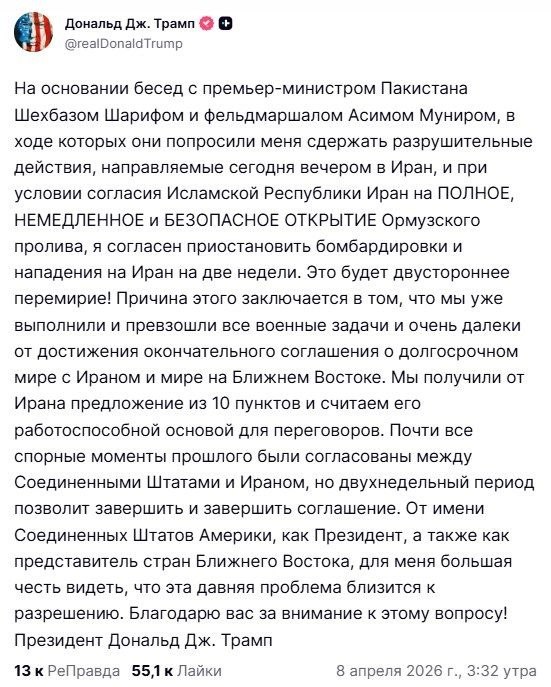 ⚡️Трамп согласился на двухнедельное перемирие с Ираном. До "сокрушительного удара", которым угрожали США, оставалось 1,5 часа
