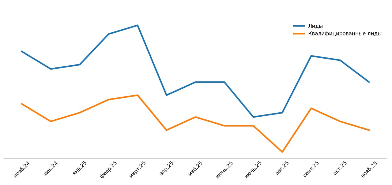 У меня тоже: на графике количество лидов и квал. лидов с ноября 2024 по ноябрь 2025. Февраль–март были самыми крутыми, видимо, на этой волне я и запускал агентство. Но далее весной спад, летом полный упадок, осенью что-то позитивное шевельнулось, но к декабрю снова падение.