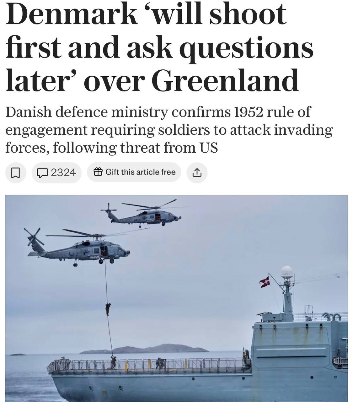 ⚡️Дания предупредила, что в случае вторжения США в Гренландию она сначала будет стрелять, а потом задавать вопросы, — The Telegraph.