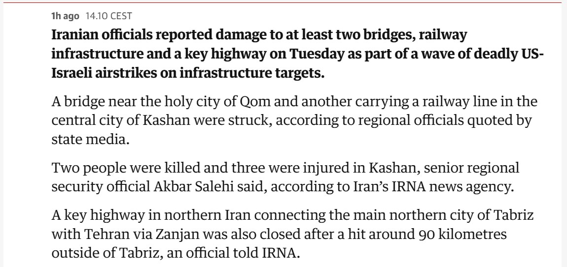 ⚡️В Иране повреждены мосты, железнодорожная инфраструктура и автомагистраль после ударов США и Израиля, — The Guardian.