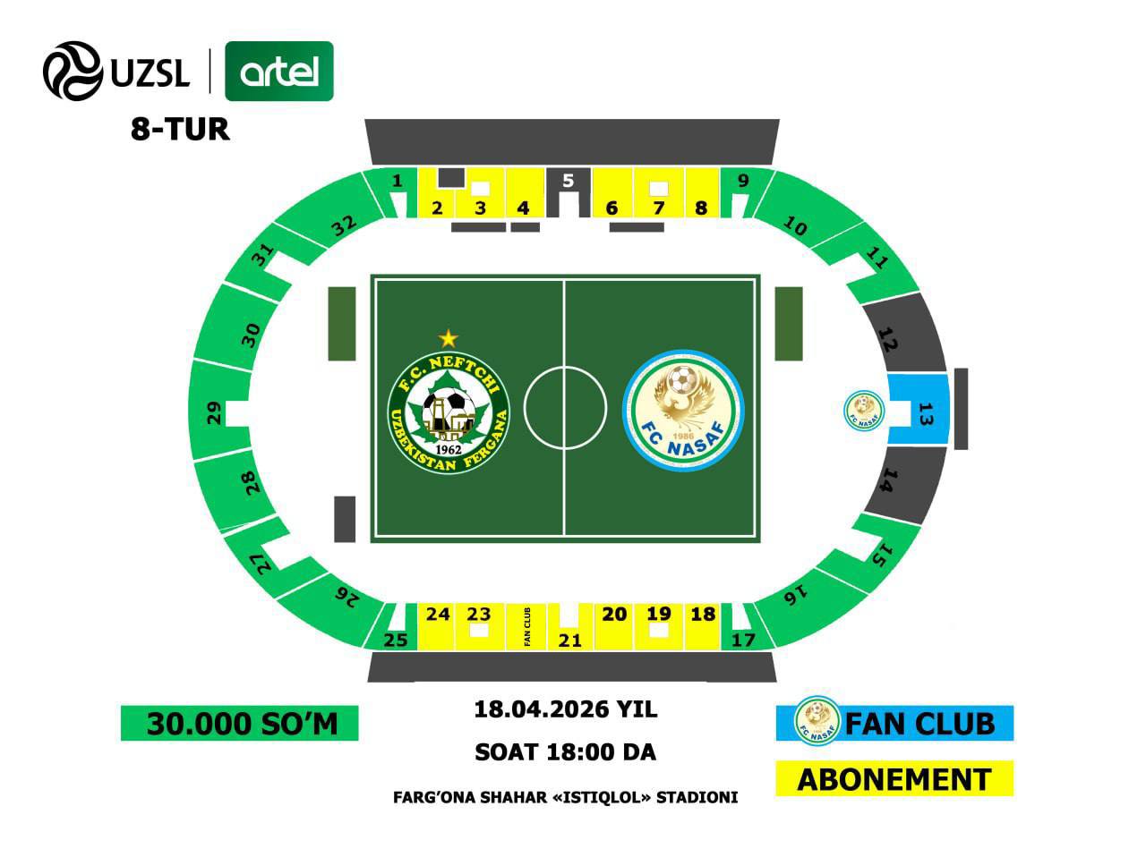 18-aprel kuni soat 18:00da O‘zbekiston Superligasining 8-tur doirasida Farg‘onaning sevimli jamoasi — Neftchi Fargʻona o‘z maydonida Qarshining “Nasaf” klubini qabul qiladi.