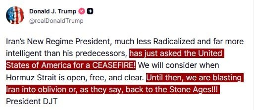 JUST IN - Trump says "Iran’s New Regime President" has asked for a ceasefire and that the U.S. will only consider it when Hormuz Strait is opened, "Until then, we are blasting Iran into oblivion or, as they say, back to the Stone Ages!!!."