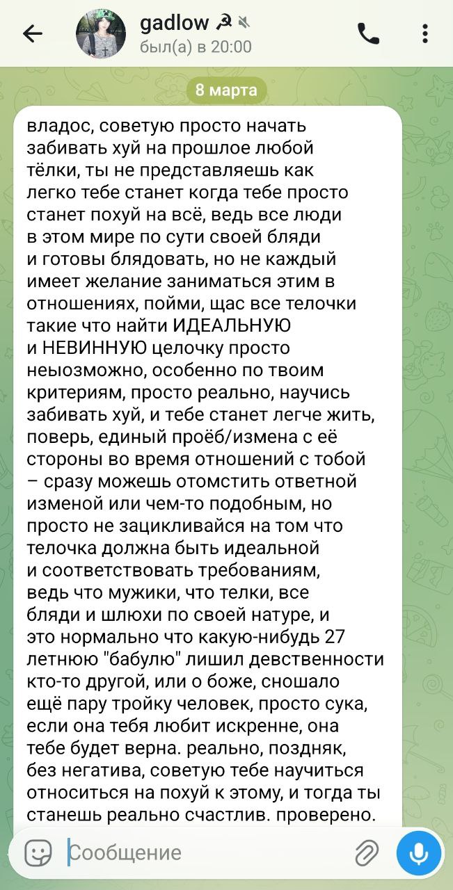 владос, советую просто начать забивать хуй на прошлое любой тёлки, ты не представляешь как легко тебе станет когда тебе просто станет похуй на всё, ведь все люди в этом мире по сути своей бляди и готовы блядовать, но не каждый имеет желание заниматься этим в отношениях, пойми, щас все телочки такие что найти ИДЕАЛЬНУЮ и НЕВИННУЮ целочку просто неыозможно, особенно по твоим критериям, просто реально, научись забивать хуй, и тебе станет легче жить, поверь, единый проёб/измена с её стороны во время отношений с тобой – сразу можешь отомстить ответной изменой или чем-то подобным, но просто не зацикливайся на том что телочка должна быть идеальной и соответствовать требованиям, ведь что мужики, что телки, все бляди и шлюхи по своей натуре, и это нормально что какую-нибудь 27 летнюю "бабулю" лишил девственности кто-то другой, или о боже, сношало ещё пару тройку человек, просто сука, если она тебя любит искренне, она тебе будет верна. реально, поздняк, без негатива, советую тебе научиться относиться на похуй к этому, и тогда ты станешь реально счастлив. проверено.