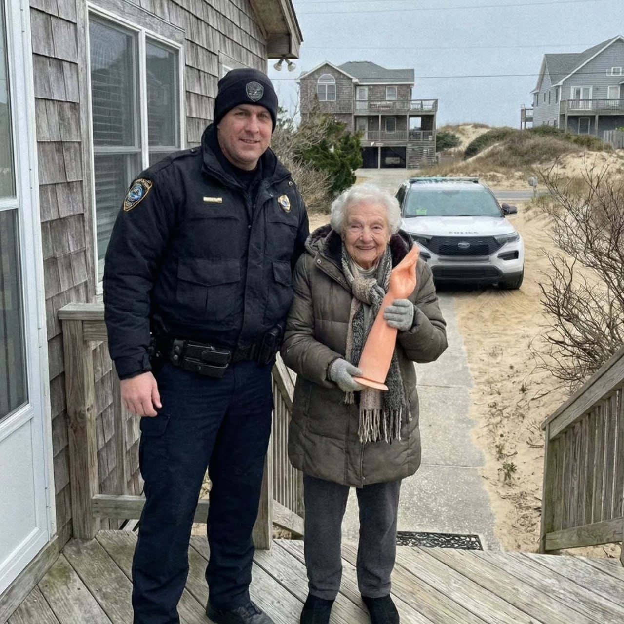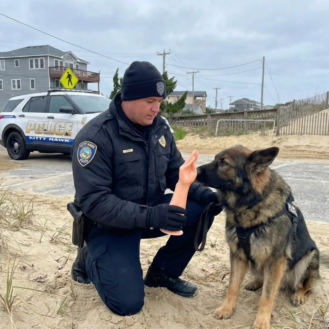 Какой-то гений сгенерировал эти четыре фотографии и распространил их в соцсетях среди сообществ старшего поколения, добавив подпись: «Полицейский с собакой помог бабушке найти её протез руки»