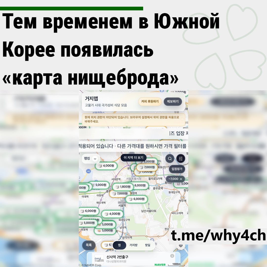 Это сайт, где можно найти заведения с дешёвыми и вкусными блюдами по всей стране. Для понимания цен на карте — 5000 вон это около 260₽. В Южной Корее настолько высокие цены на аренду жилья и еду, что по-другому студентам выживать сложно. Из локальной истории «карта нищеброда» превратилась в сервис национального масштаба. 4ch