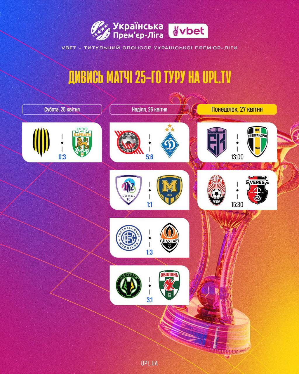 Результати всіх матчів 25-го туру VBET Української Премʼєр-Ліги! 🏆
