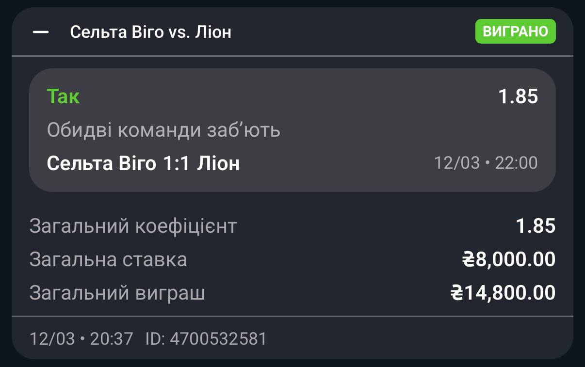 Лион четыре матча без побед после 13 выигрышей подряд, но забивают регулярно в каждой игре. Сегодня их ведут аутсайдерами, но как минимум разок они отличались в гостях и против Марселя, и Лилля, и Монако, и против Ланса, а не забили с сильными только Бетису. Сельта дома сильна, их гол рассматривается по умолчанию, но думаю и гости своё забьют.