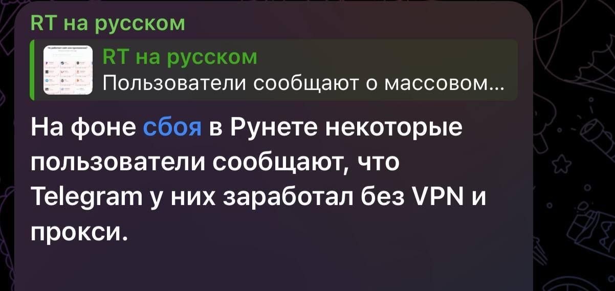 😐 Телеграм заработал без прокси и VPN у многих россиян на фоне глобального сбоя Рунета.