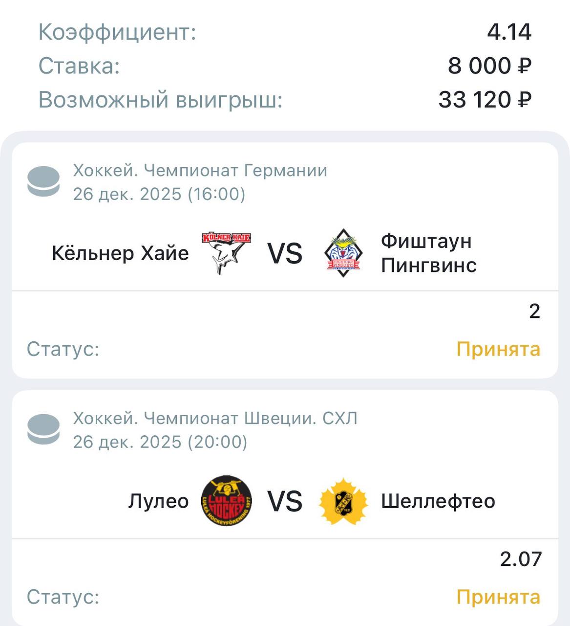 На завтра я уже для вас заранее собрал двойник. Двинем через Европу. Сначала дам прогноз по матчу регулярного чемпионата Германии между «Кёльнер Хайе» и «Фиштауном». Затем переместимся в Швецию и обсудим игру между «Лулео» и «Шеллефтео».