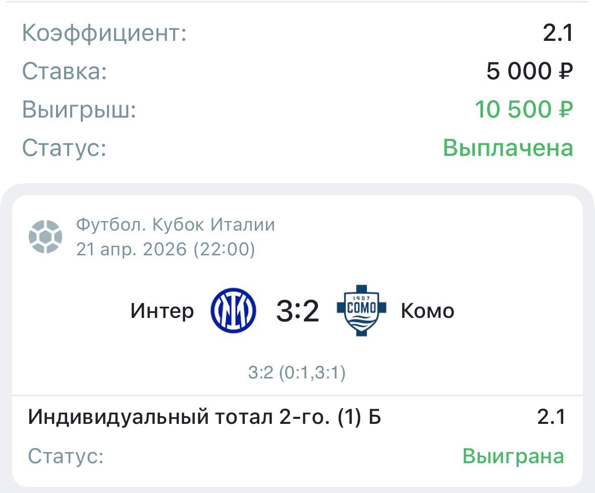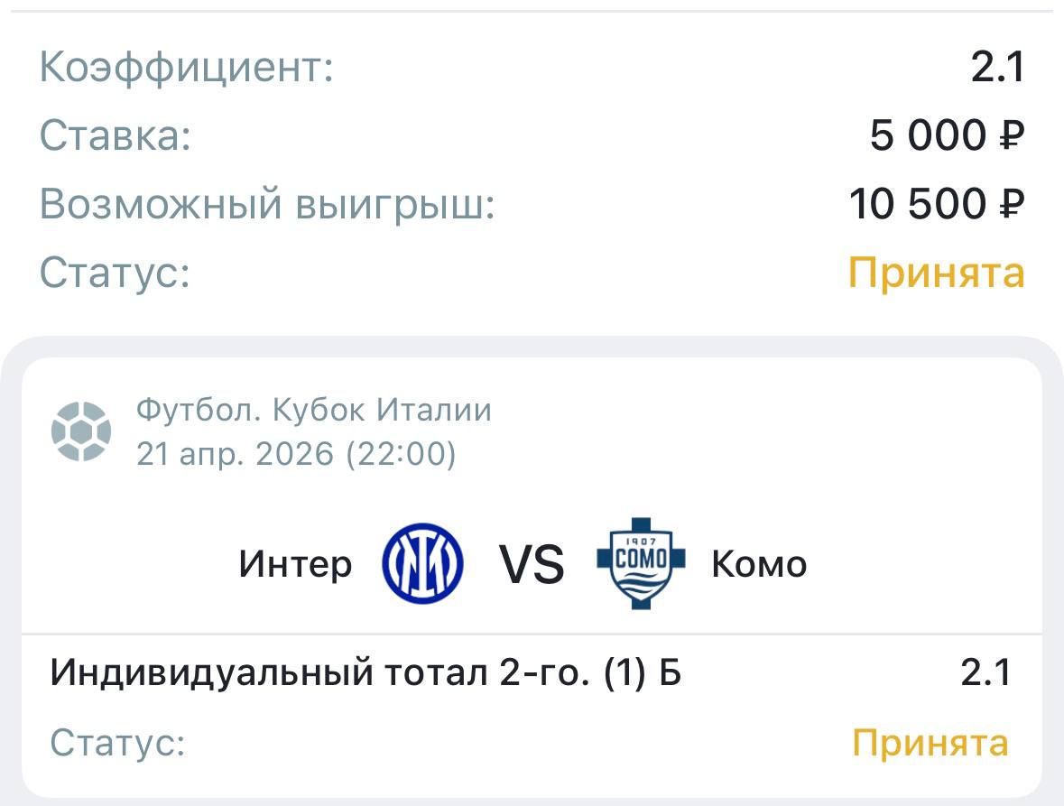 Комо хоть и уступил в чемпионате Интеру, но играли намного лучше, да и в первой игре кубка были острее, поэтому и сегодня я жду от них той же игры и хотя бы 1 мяч забивать обязаны.