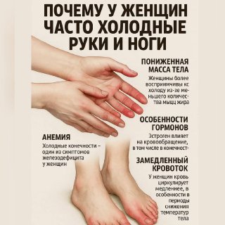 Когда кровь медленнее добирается до конечностей — тело старается «сохранить тепло» для жизненно важных органов. Поэтому ладони и стопы остаются ледяными, даже если весь остальной организм чувствует себя нормально.