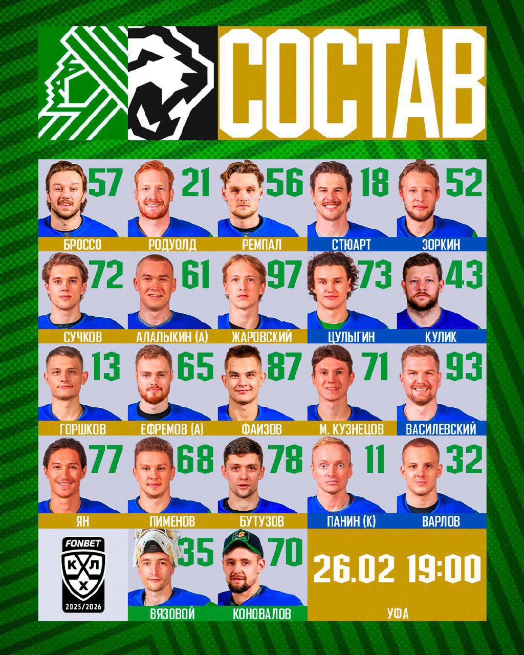 У Салавата тоже в обойме все, кроме Кузи – но он не единственный, кто забивает! Обращаю внимания на тройку канадцев в первом звене – Ремпал готов набирать очередные голы и очки✅
