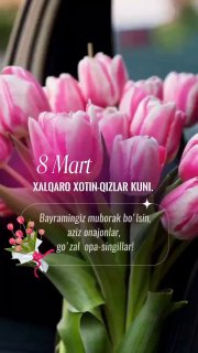Азиз оналар, опа-сингиллар, меҳрибон устозлар ва гўзал аёллар! Бугунги байрам сизларнинг меҳрингиз, сабрингиз ва гўзаллигингиз шарафига бағишланади! Сизлар – оила таянчи, жамият гултожи ва муҳаббат тимсолисиз!