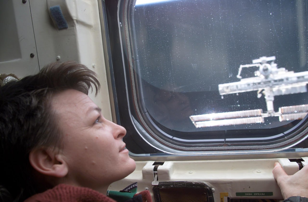 Астронавт Пегги Уитсон смотрит на Международную космическую станцию из окна челнока «Индевор». 2 декабря 2002 г.
