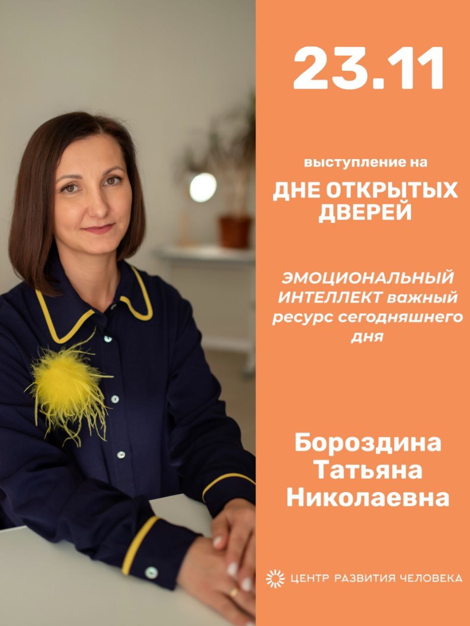 На Дне открытых дверей ЦРЧ 🔆23 ноября психолог Татьяна Николаевна Бороздина расскажет, как понимать свои эмоции и эмоции других, управлять стрессом и сохранять контакт даже в сложных ситуациях.