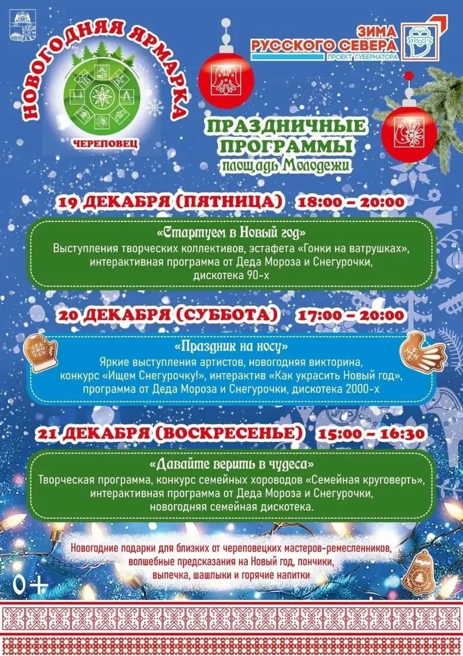 На площадке также будут представлены новогодние подарки от череповецких ремесленников, предсказания на Новый год и угощения.