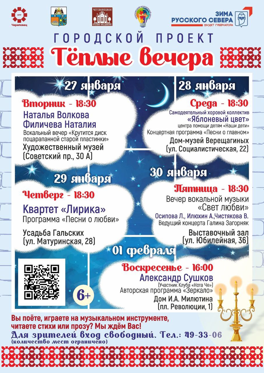 · 30 января в 18:30: Вечер вокальной музыки «Свет любви» в исполнении Л. Осиповой, А. Илюхина, В. Чистяковой в Выставочном зале (ул. Юбилейная, 36).