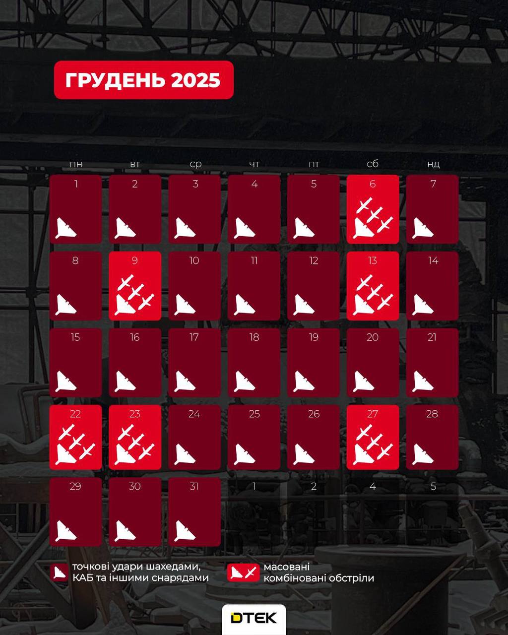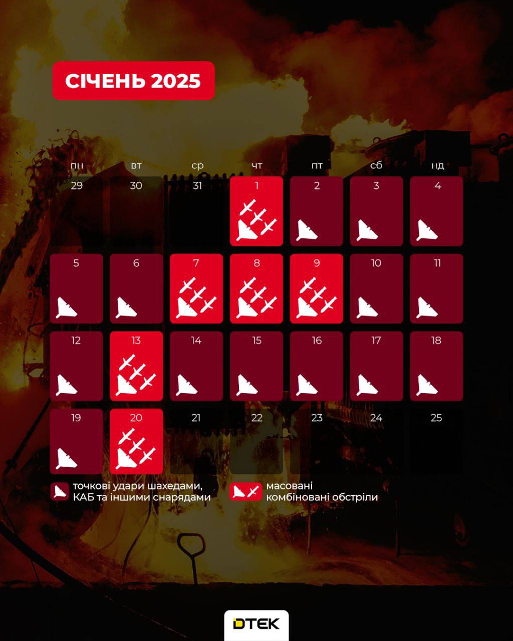 👉 Систематичність масованих атак. Червоні квадрати – це дні, коли росіяни застосовували усе наявне озброєння для комбінованих обстрілів. Їхня щільність вражає.