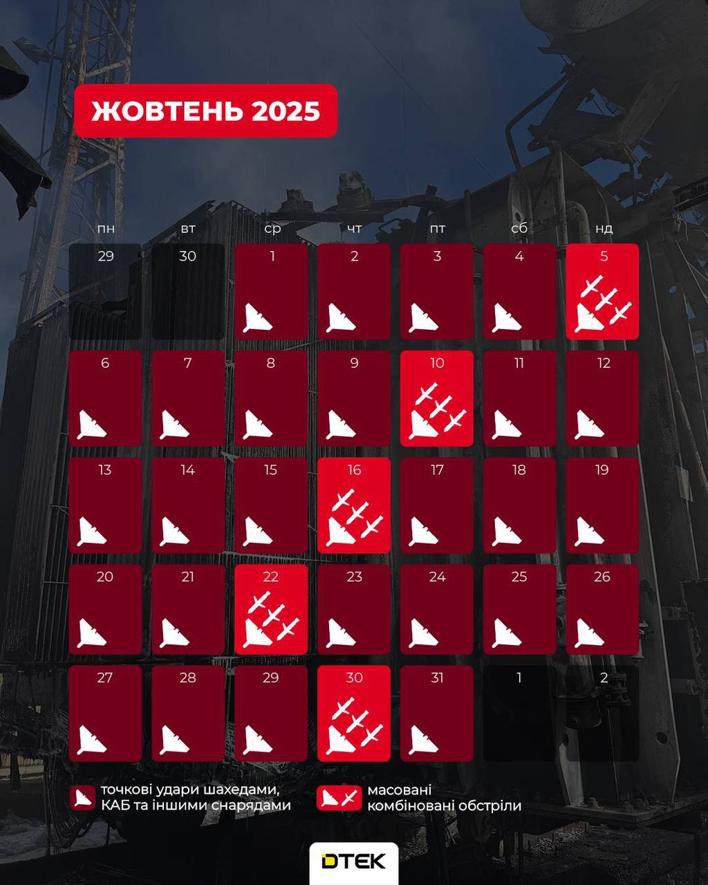 👉 Жодного спокійного дня. Погляньте уважно: у нас фактично немає «білих» днів. Кожна дата позначена білим трикутником – це щоденні точкові удари «шахедами», КАБами та артилерією по енергооб’єктах.