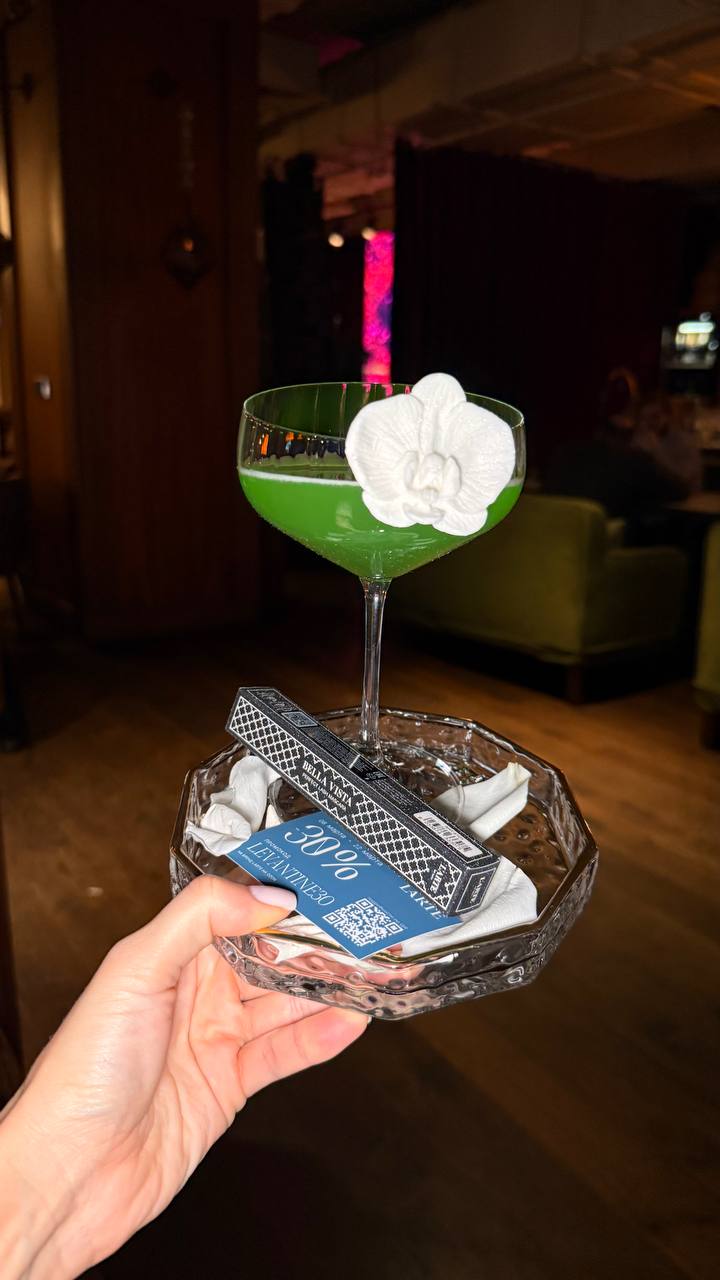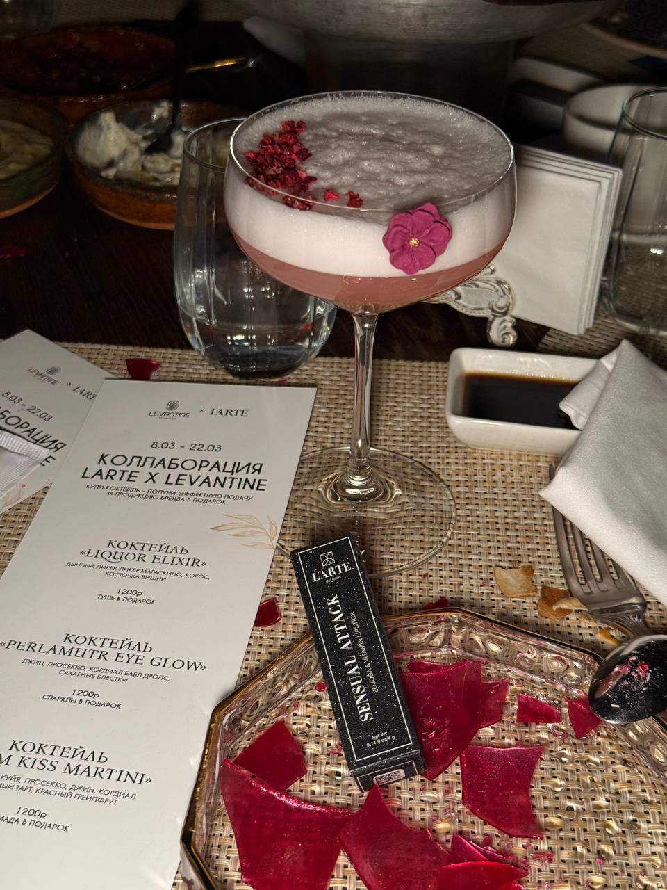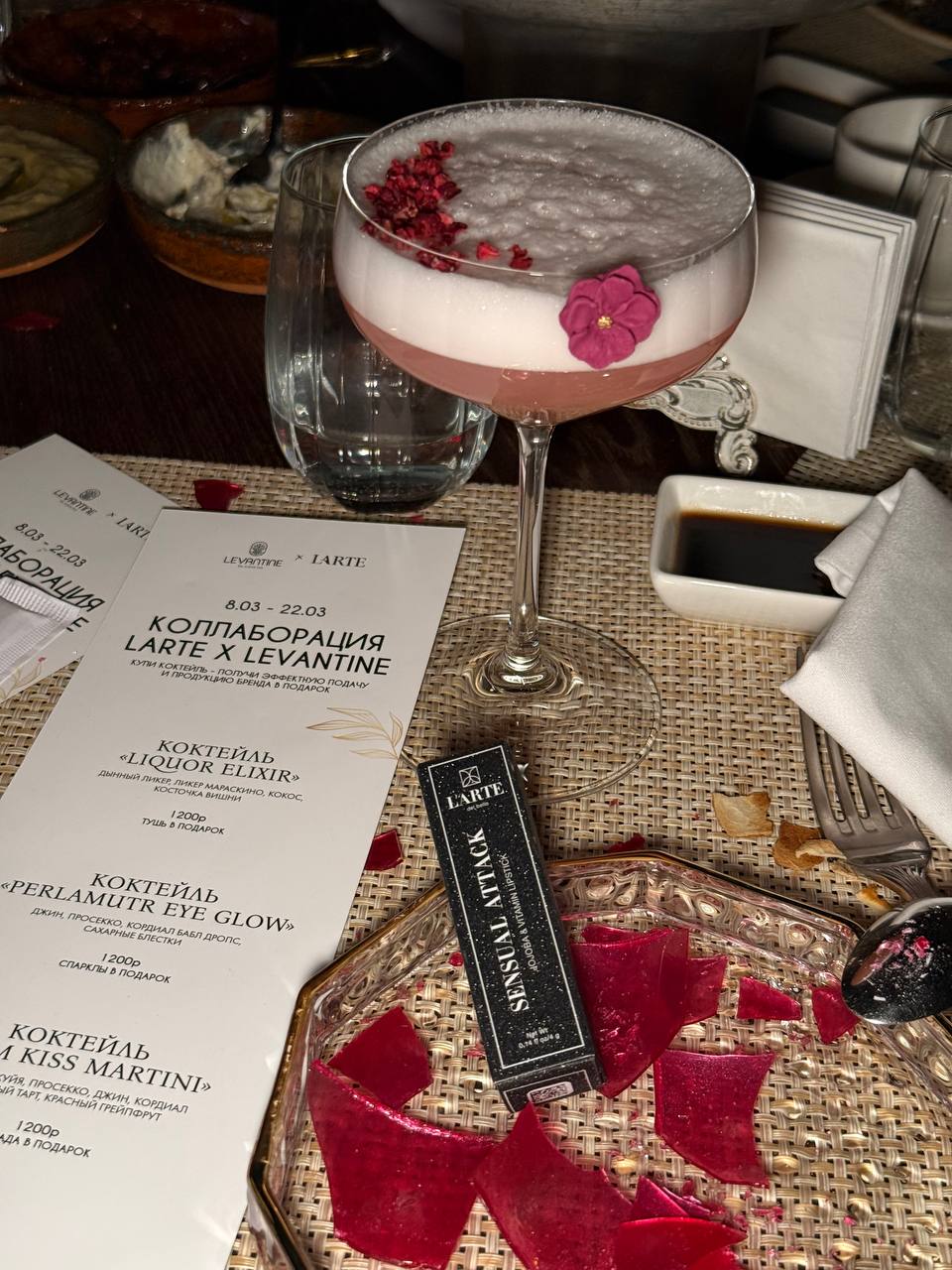 А коллаборация такова: в ресторане LEVANTINE можно купить коктейли и к каждому коктейлю будет подарок (тушь, помада с кнопкой, сияющие тени).