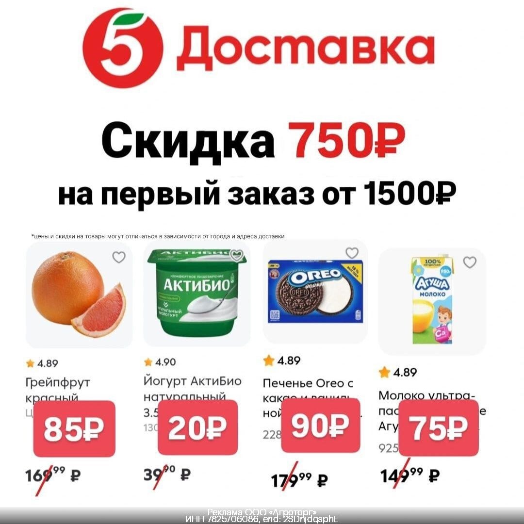 🥕 Новый промокод на скидку -750₽ в Пятёрочка Доставка