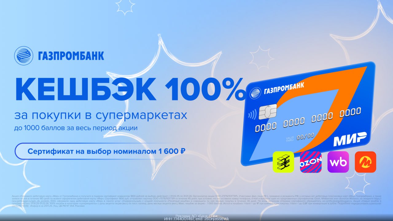 💰 Сертификат на 1600₽ на выбор + кешбэк 100% в супермаркетах только при оформлении дебетовой карты «Мир» от Газпромбанка!