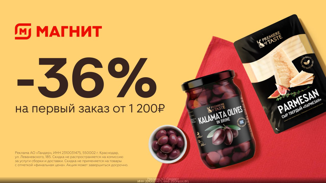 *Предложение действительно 06.03.2026 в магазинах М.Кос и мобильном приложении «Магнит: акции и доставка» (6+) с картой лояльности Магнит Плюс. Скидка действует на весь ассортимент. Количество товара ограничено. Подробности у продавцов и в мобильном приложении. АО «Тандер», ОГРН 1022301598549, г. Краснодар, ул. им. Леваневского, 185.