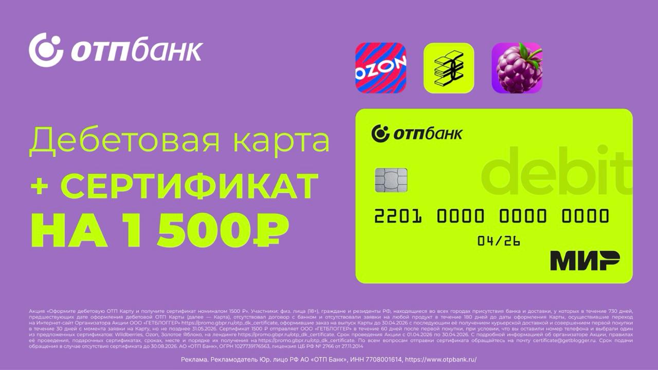 🏦 Сертификат на 1500₽ в подарок при оформлении дебетовой карты ОТП Банка