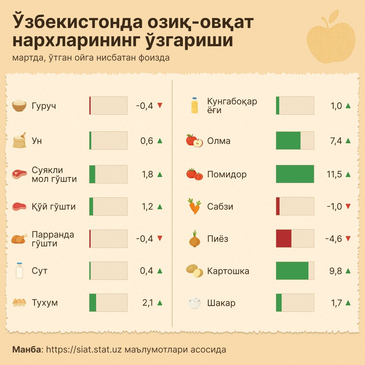📈🍅 Март ойида озиқ-овқат нархи қандай ўзгарди?