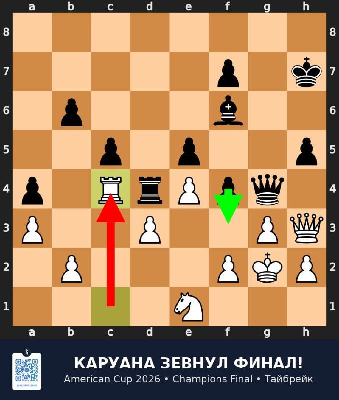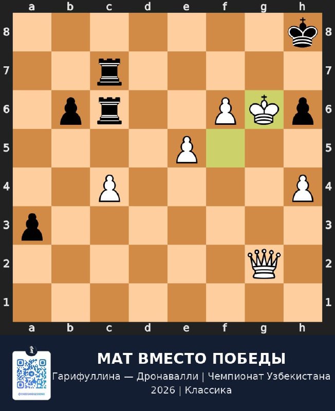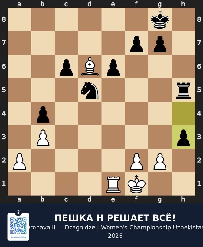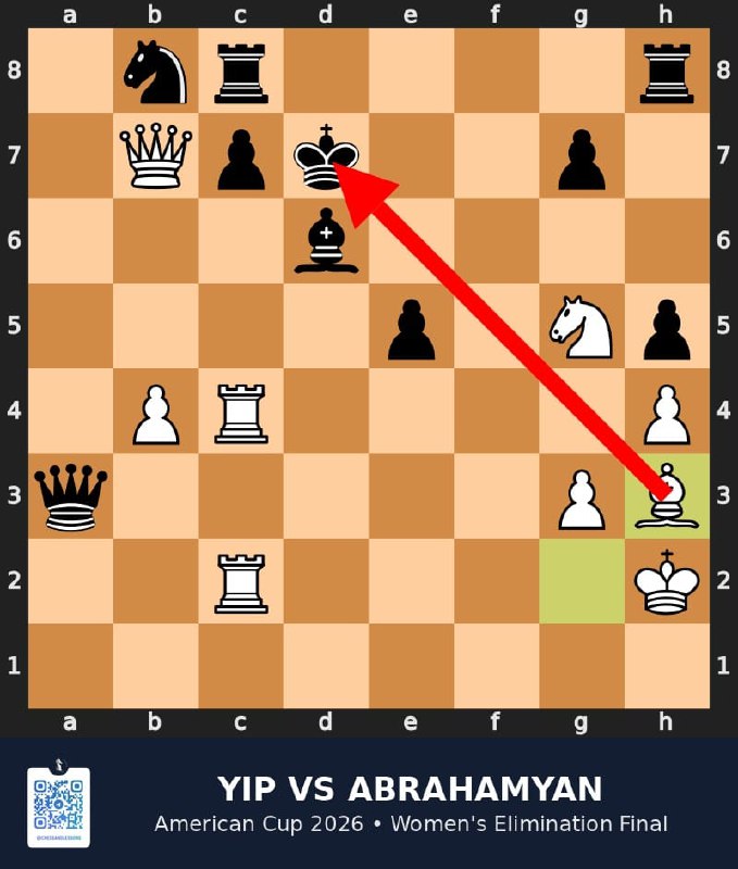 В цейтноте Абраамян потеряла нить: 20...Сxc4? вместо Фb6, и после 21.Фxb7+ чёрный король побежал в центр. Финальный аккорд — 27.Сh3+, слон выходит на диагональ, и мат неизбежен.