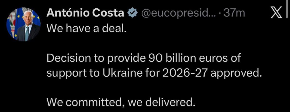 ⚡️Голова Європейської ради Антоніу Кошта заявив, що ЄС досяг угоди про фінансування України на 2026-27 рік обсягом 90 млрд євро