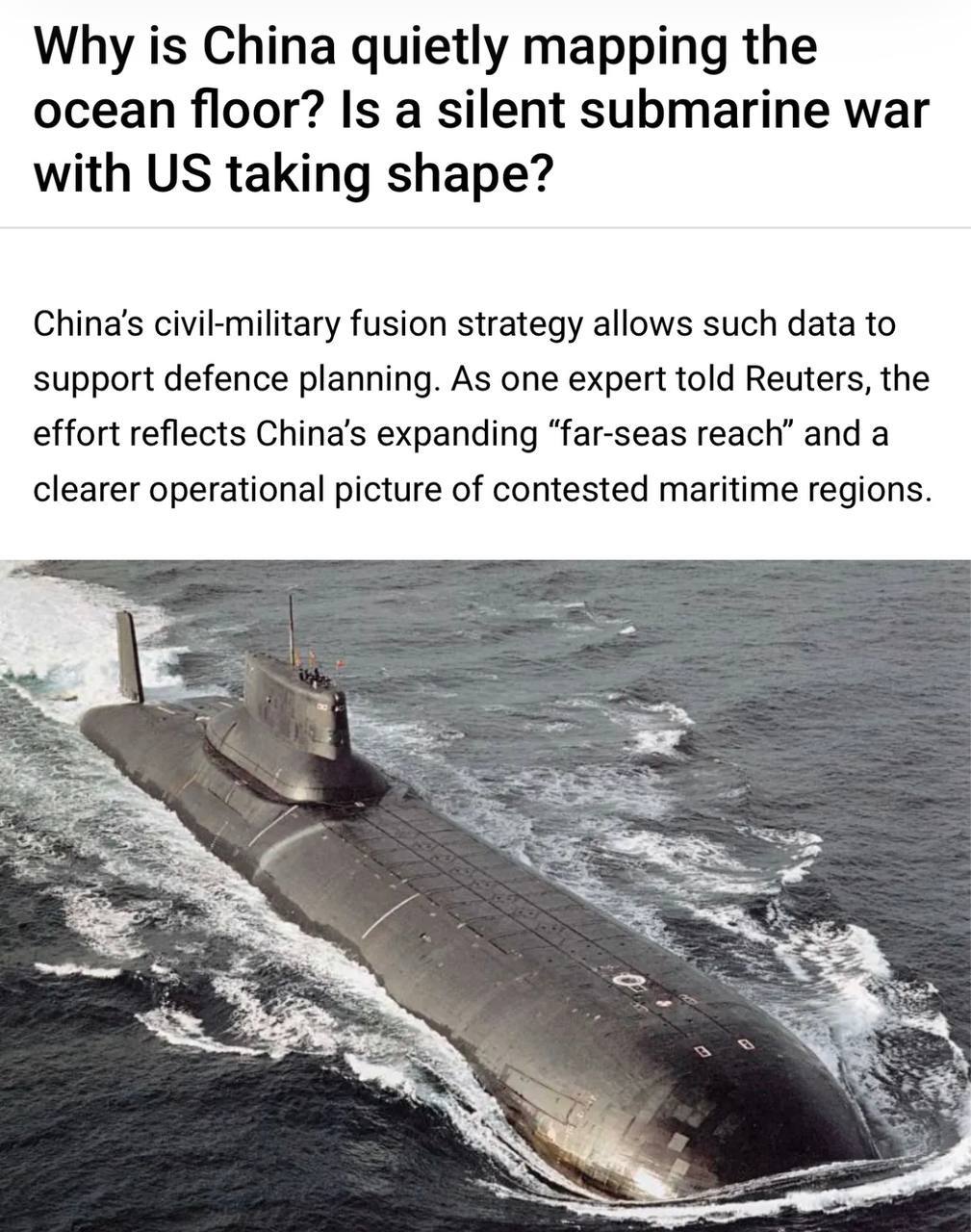 Ще цікавіше — Китай хоче створити «прозорий океан»: мережу підводних датчиків, яка буде постійно «слухати» і відстежувати все, що відбувається під водою. Це допомагає легше знаходити підводні човни. І саме ці дослідження ведуться біля Гуаму — місця, де базуються американські субмарини.