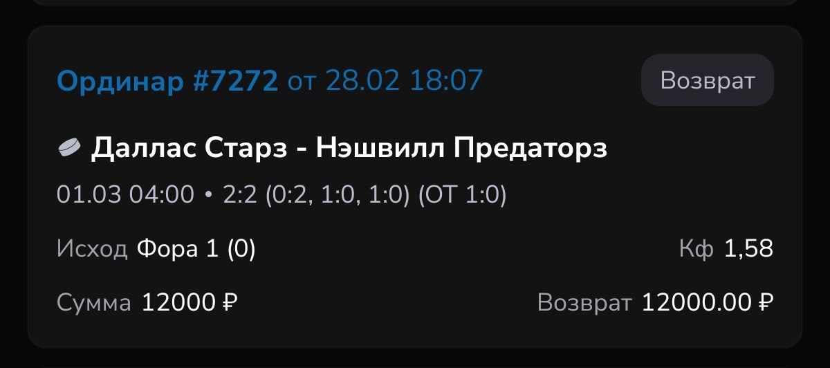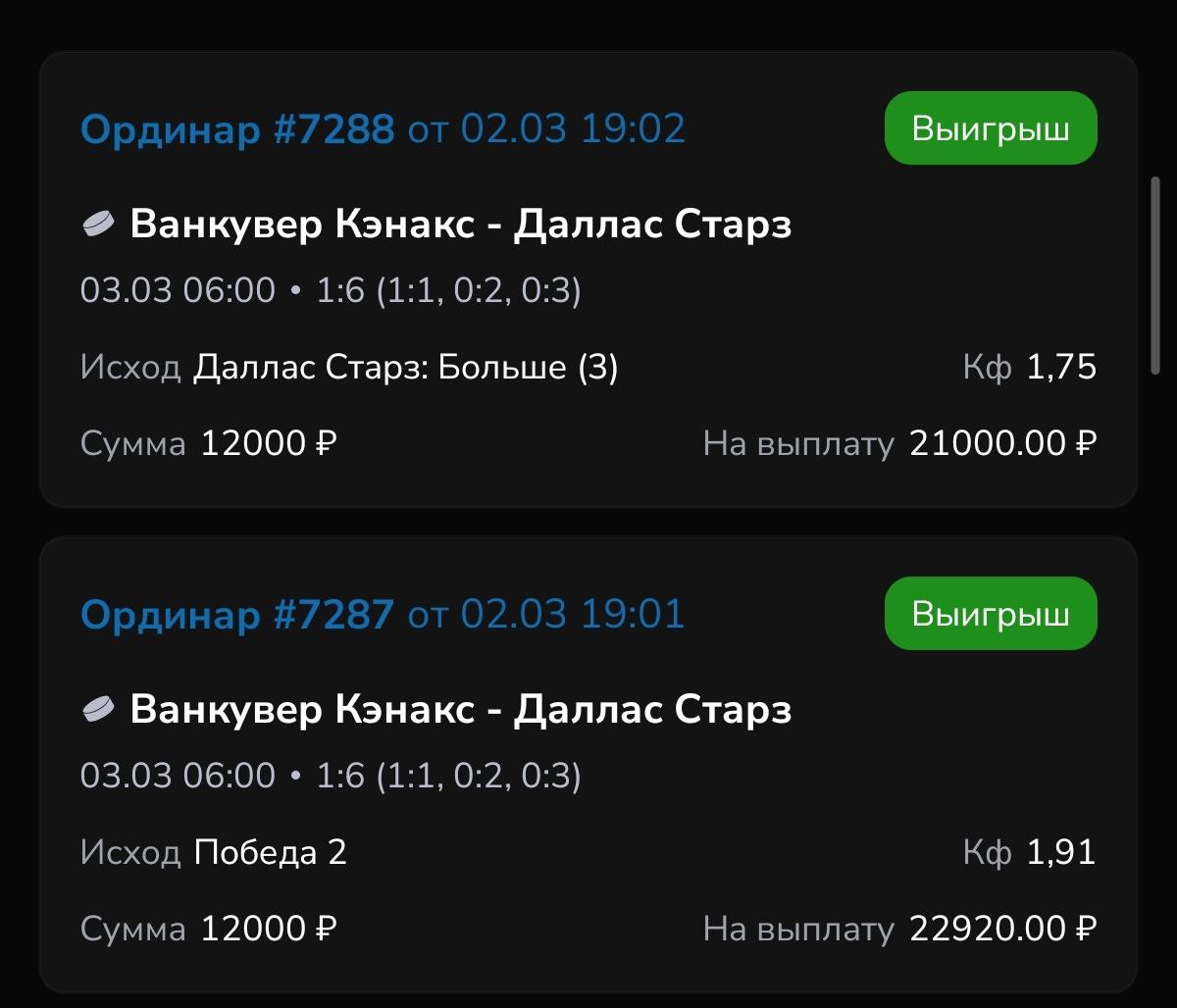 Даллас мы уже брали, сильная команда да ещё и на отдыхе, пока не видел команду в НХЛ кто более собраннее выглядит на льду после такого перерыва, они играют дома против удобного Нэшвилл. Львы сейчас пытаются пробиться в плей-офф, 9 строчка времени не так много, будут подстраиваться под соперника, а против Далласа практически никто не может ничего показать когда 2 дня на подготовку дано, Нэшвилл 27 число сыграл против Чикаго, соперник был максимально простой, поэтому они победили.. Рантанен получил травму на олимпиаде, поэтому его сегодня не будет, но не думаю что Даллас стал слабее от этого, они легко Раздалбали сильный Сиэтл 4-1, защита и нападение реально на сильном уровне. Нэшвилл взял верх на своем льду над Чикаго со счетом 4:2. Правда, по итогам этой встречи команда достигла отметки в 200 пропущенных шайб. Больше на Западе позволили соперникам забить в свои ворота только два клуба, выездные встречи у Львов просто птзда какая-то 4 поражения в 5 матчах, ну это домашняя команда о чём здесь говорить. В бесплатном канале прежде чем поставить на мои прогнозы хорошо подумайте готовы вы сегодня проебать или нет, ставить лучше всегда до 5% от банка или фрибеты, просто нафиг своими рисковать, фрибет забирайте в пари по промокоду ovechkin до 5тр дают,когда регаешься ввести надо, по тихоньку двигайтесь, выйграл проебал это всё спорт, давайте с головой всё. В ВИП ИДЁМ ЗА 10+/1-, В вип я работаю по экспрессам с средним кф3.70🔥 ВСЕХ ЖДУ В КОМАНДУ БУДЕМ РАБОТАТЬ ВМЕСТЕ, НХЛ ВЕРНУЛСЯ!!! легко можно делать плюсы и развиваться, и вы обязательно должны быть со мной. Экспрессы даю каждый день, использую для проверки искусственный интеллект, в месяц 30 штук, каждый выходной +1 день, никогда не даю чепуху, максимально ответственный подход к делу, мой результат говорит сам за себя, мы №1 среди честных верифицированных каналов по спорту с аудиторией до 10к подпичиков , проходимость наших матчей из которых состоит экспресс 80-85%, заход экспрессов в среднем 2+ на 1-, мы номер 1 среди всего честного бетинга, бесплатный канал это главное подтверждение честной и умной аналитики, присоединяйтесь: @Andrei_empire