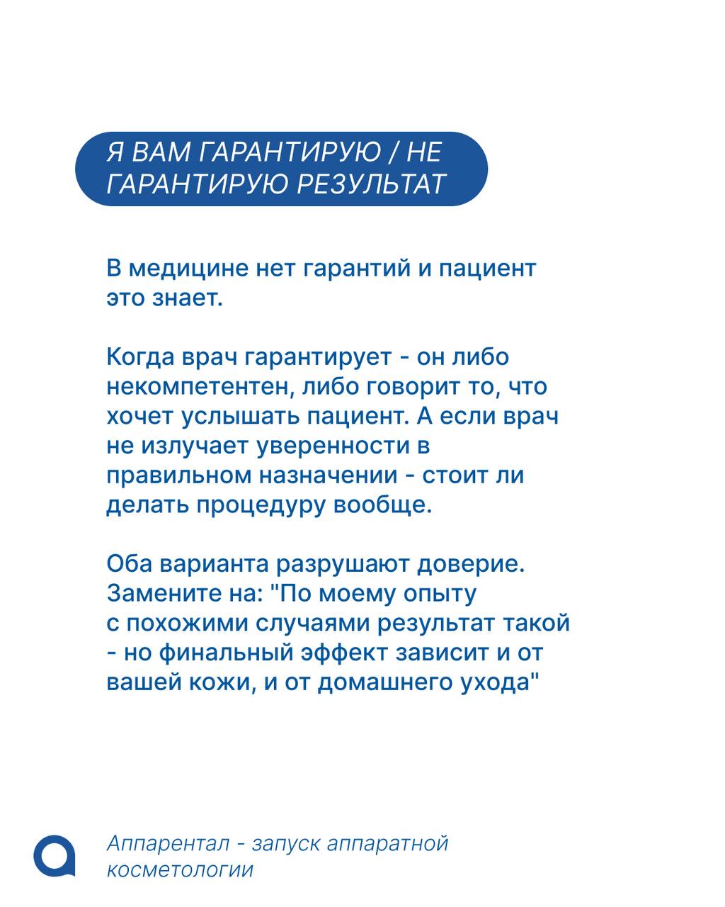 Когда нет готовых формулировок, мы начинаем импровизировать, а импровизация в продажах — это риск: пациент не понял, не проникся, не купил.