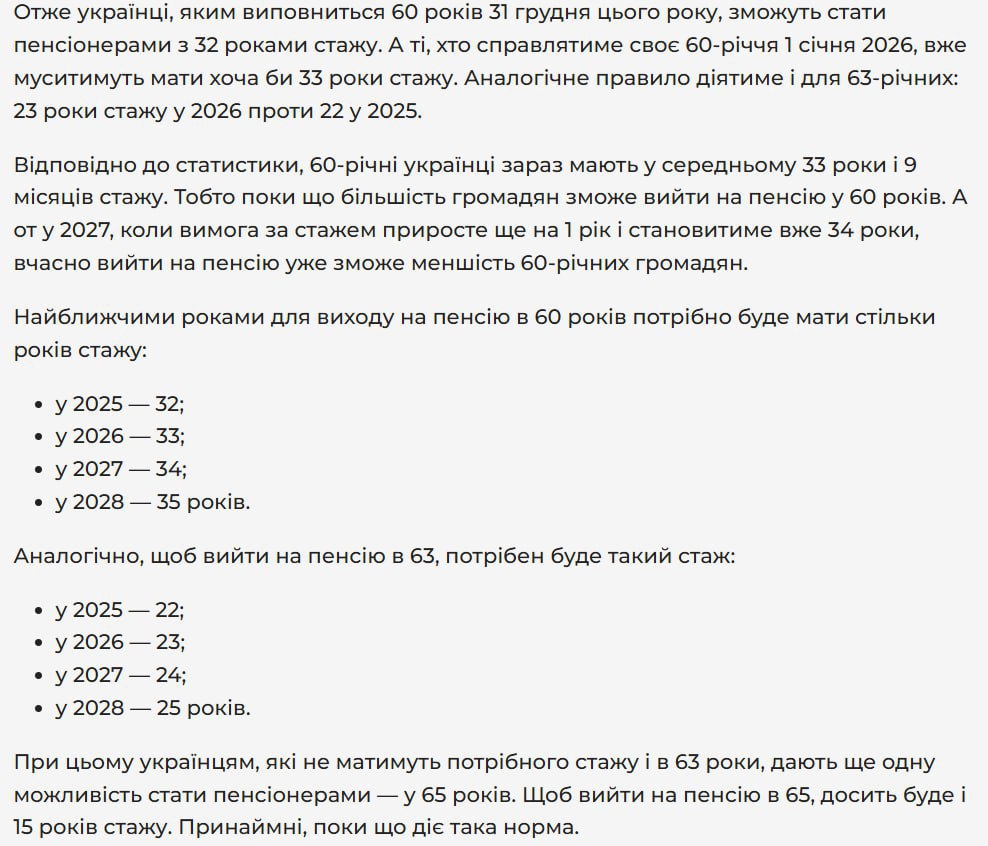 З 2026-го року почнуть діяти нові нормативи для виходу на пенсію. А саме — зросте вимога до стажу. Щоб вийти на пенсію у 60 або в 63 роки, треба буде мати більше страхового стажу, ніж його потрібно зараз.