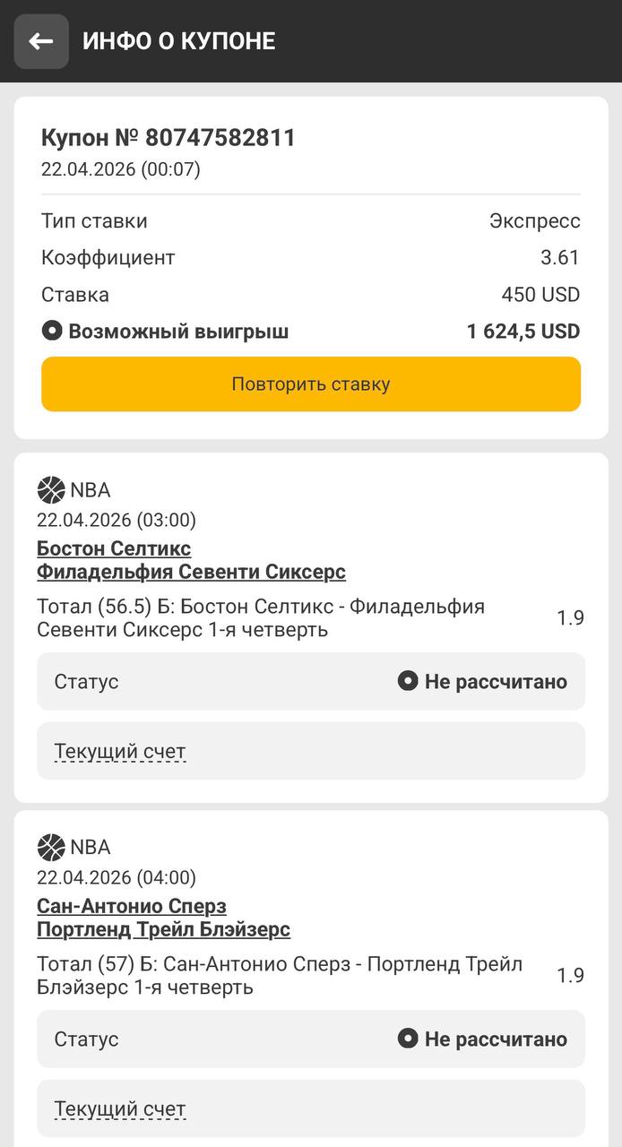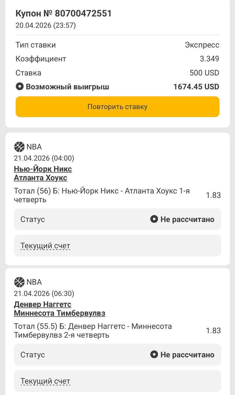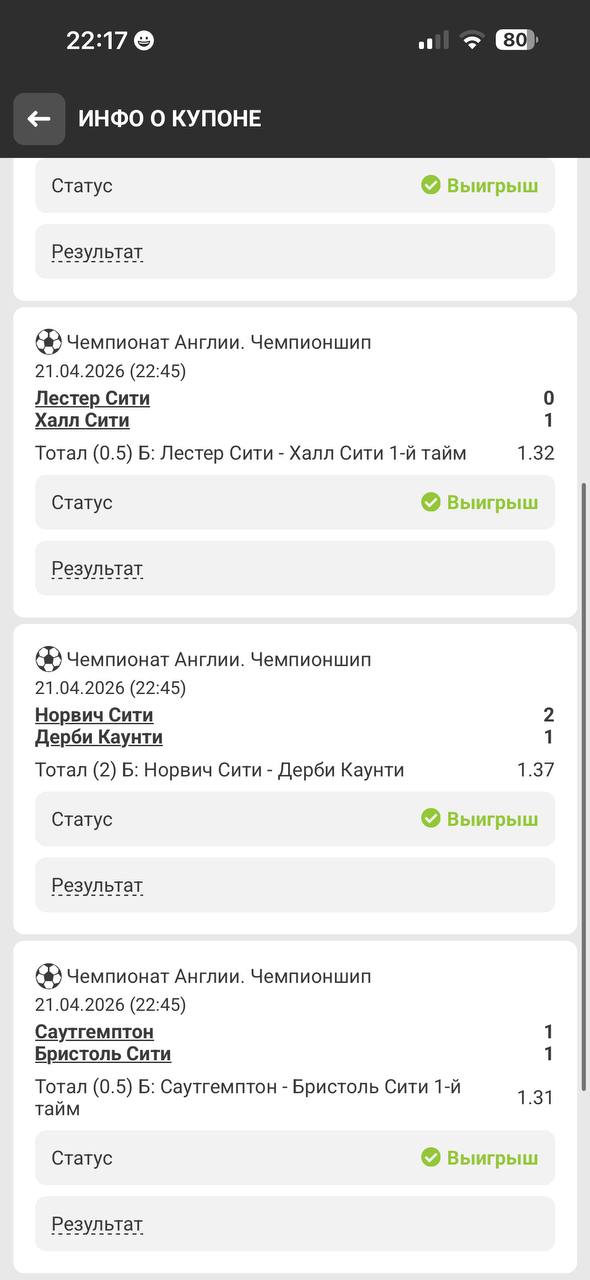 Доброе утро! Вчера 3✅ из 4 заявленных забрали, пожалуй огонь результат! Продолжаем набирать людей на после оплату; если вы не уверены в себе и в своих силах - лучше не пишите, а если хотите на дистанции двигаться со мной + получать экспрессы без предоплат и платить по факту выигрыша, у вас есть шансы запрыгнуть в команду❗️