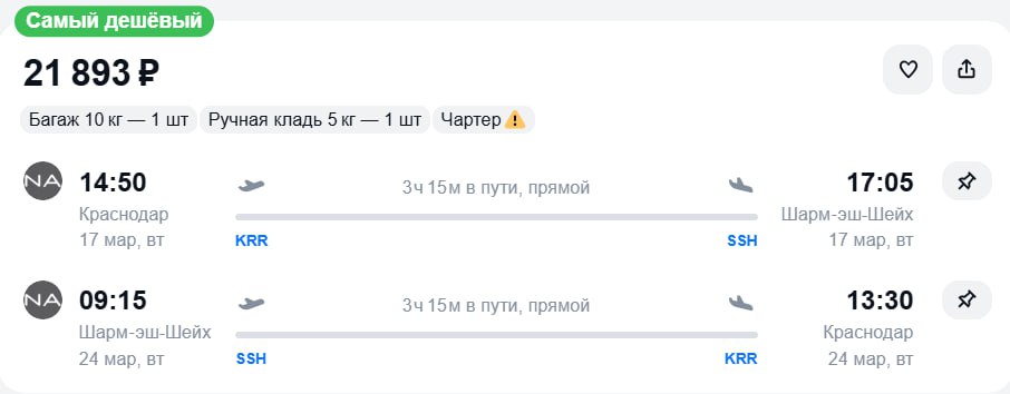 Чартер из Краснодара в Шарм-эш-Шейх за 21900 рублей в обе стороны