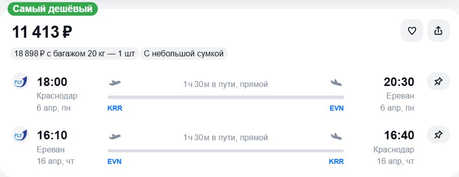 • Москва — Ереван (Армения) 1 – 10 апреля от 23 683₽ туда-обратно (с багажом 25кг).