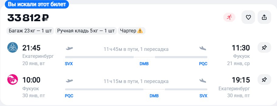 🔥Чартер из Екатеринбурга на Фукуок за 33800 рублей в обе стороны, пересадка в Тараз