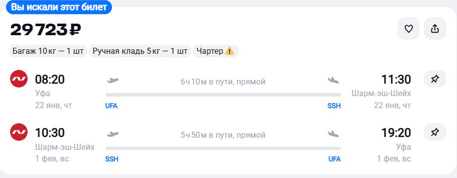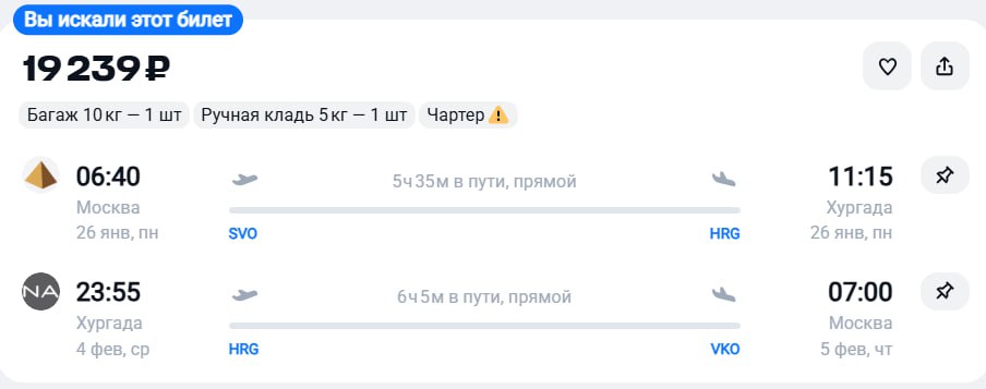 Чартер из Москвы в Хургаду за 21400 рублей в обе стороны 19 января - 26 января https://aviasales.tpo.li/yR87av67 Приложение для поиска билетов: iOS и android Больше билетов в канале ✈️ Чартерный