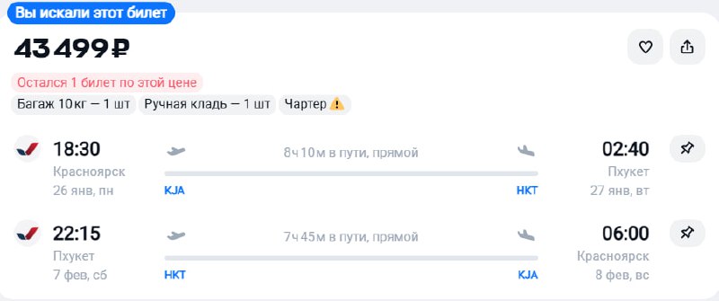 Прямые рейсы из Хабаровска на Пхукет за 53600 рублей в обе стороны 22 января - 1 февраля https://aviasales.tpo.li/AZJCXGxn Приложение для поиска билетов: iOS и android Больше билетов в канале ✈️ Чартерный