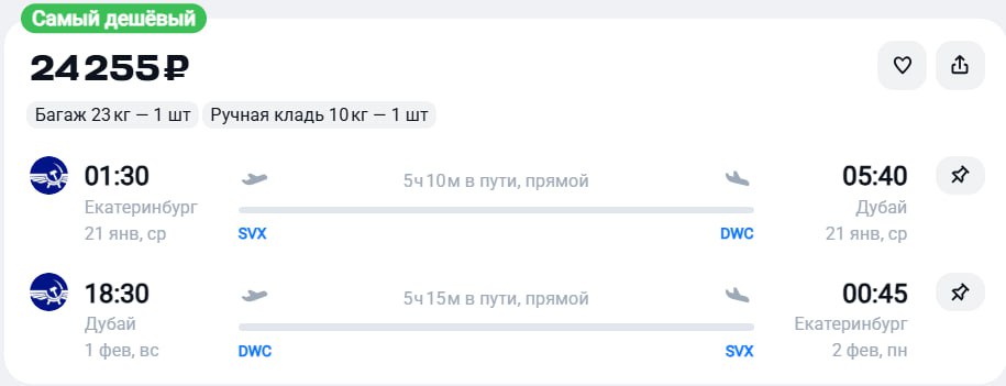 Чартер из Новосибирска на Дубай за 25300 рублей в обе стороны 21 января - 28 января https://aviasales.tpo.li/bJl8ZwQ7 Приложение для поиска билетов: iOS и android Больше билетов в канале ✈️ Чартерный