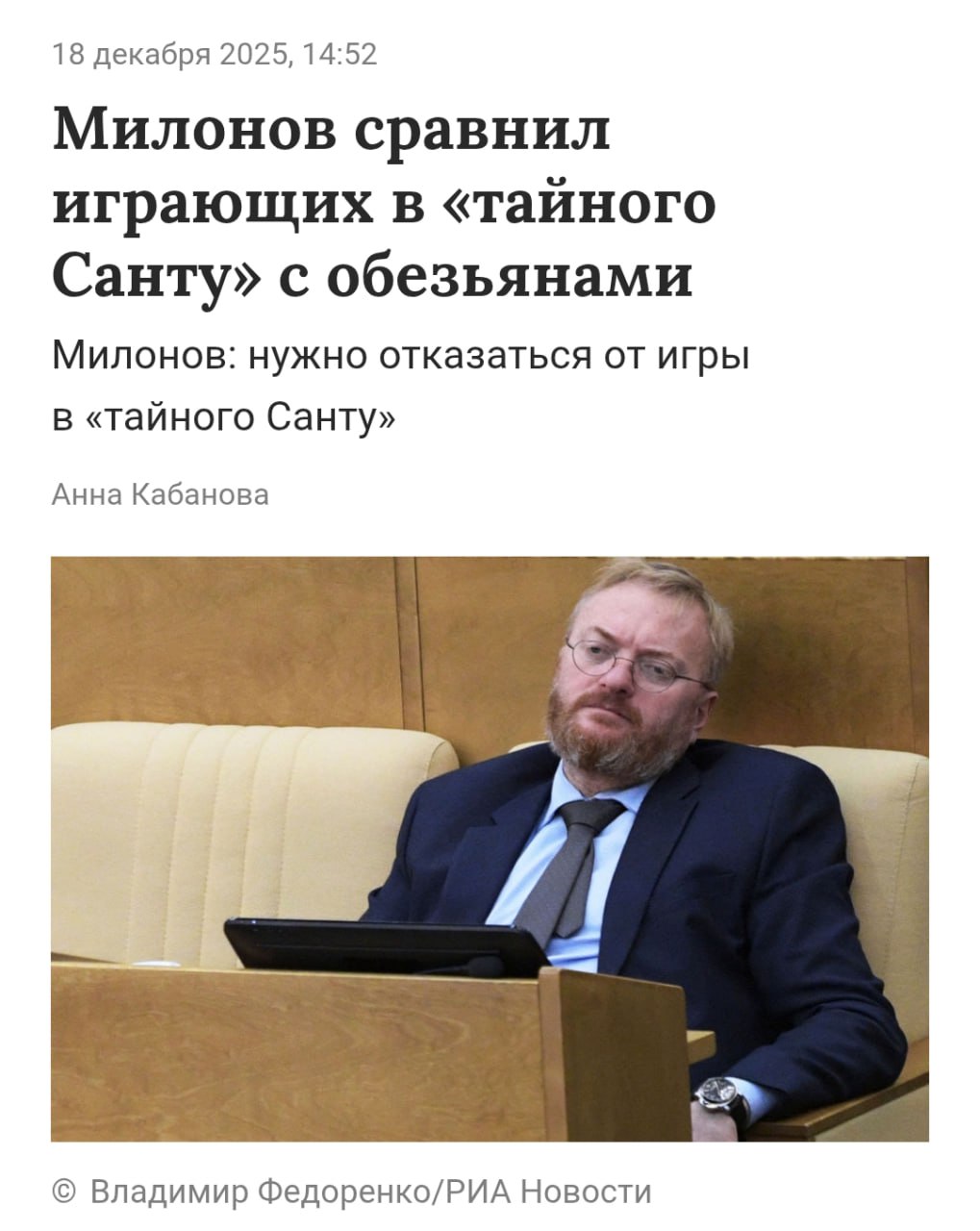 Все играющие в Тайного Санту — обезьяны. Депутат Милонов твёрдо и чётко предложил запретить забаву в России:
