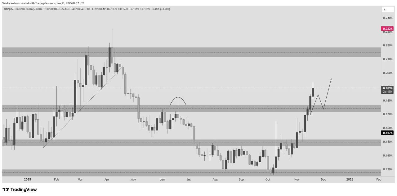 Это плохой знак для биткоина. Доминирование стейблкоинов после этого дневного закрытия выше 0,177% полностью превратило это долгосрочное дневное сопротивление в поддержку впервые с мая. Даже если будет повторное тестирование на уровне 0,177%, который теперь является большой поддержкой, ожидается, что индекс поднимется до 0,211%, что, скорее всего, соответствует поддержке биткоина в районе $75K - $73K.