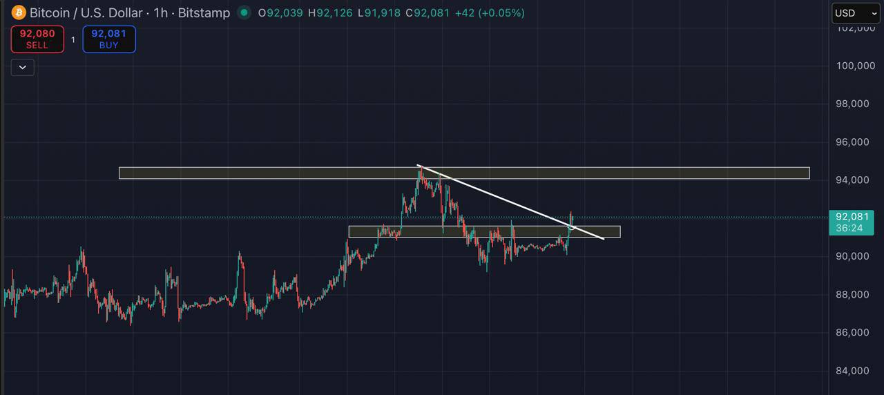 Теперь вы можете видеть, что BTC повторно протестировал уровень поддержки в $90,000 и отскочил вверх. Далее он несколько раз протестирует ключевой уровень сопротивления в 95,000.
