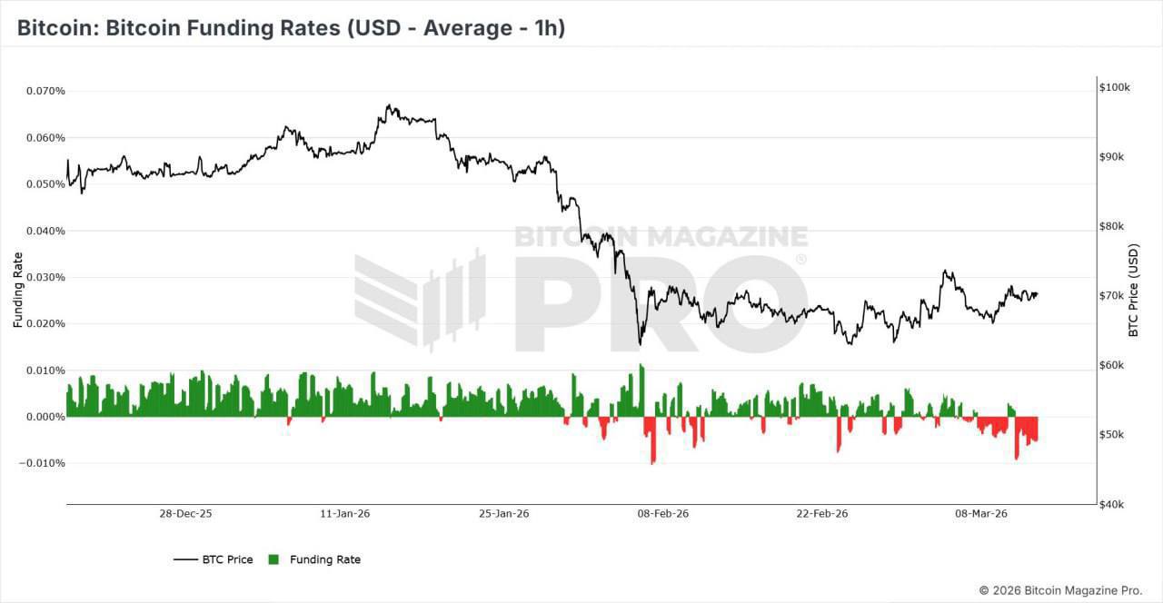 В последние дни ставки финансирования BTC все больше уходят в отрицательную зону. В то же время цена продолжает расти и держится около 70 000 долларов США.