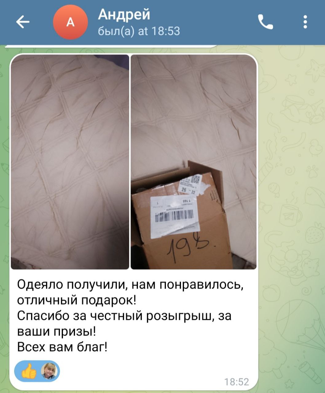☺️очему настроение хорошее, подарочек дошёл и получен победителем, а для меня очень важна обратная связь. Я очень радуюсь за людей, за их маленькую победу, за их счастливую возможность, которую дала им судьба, в которой участие принимала я и дала им шанс почувствовать себя особенными, увидеть свою значимость и уникальность. Ведь каждый подарок — это не просто вещь, а знак внимания, уважения и заботы. И когда этот подарок доходит до адресата и приносит радость, сердце наполняется теплом и гордостью за то, что смогла сделать чью-то жизнь чуть ярче и светлее.