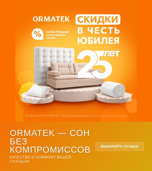 Привет, друзья! Сегодня хочу поделиться с вами классным магазином, где можно обновить спальню и создать максимально комфортные условия для сна. В Ormatek найдёте матрасы — от детских до беспружинных, мебель для спальни, текстиль и аксессуары. А ещё там есть полезные статьи про сон и бонусная программа для покупателей. Заглядывайте, может, как раз что-то нужное ищете! 😊